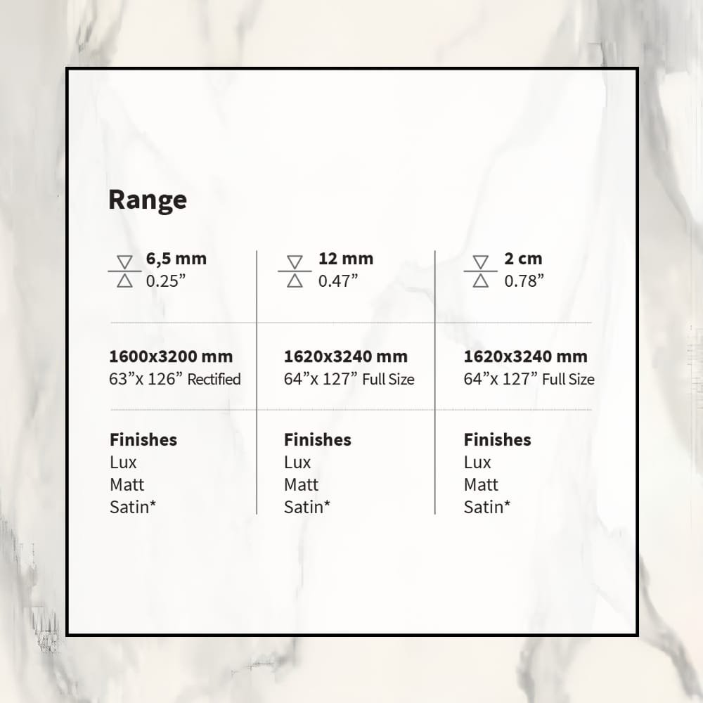 You select 6.5 mm, 12 mm, or 2 cm thickness options easily. Furthermore, choose Lux, Matt, or Satin finishes flexibly. Sizes reach 1620×3240 mm full size boldly. Rectified format delivers 1600×3200 mm precisely. Thus, grand surfaces integrate flawlessly every time.