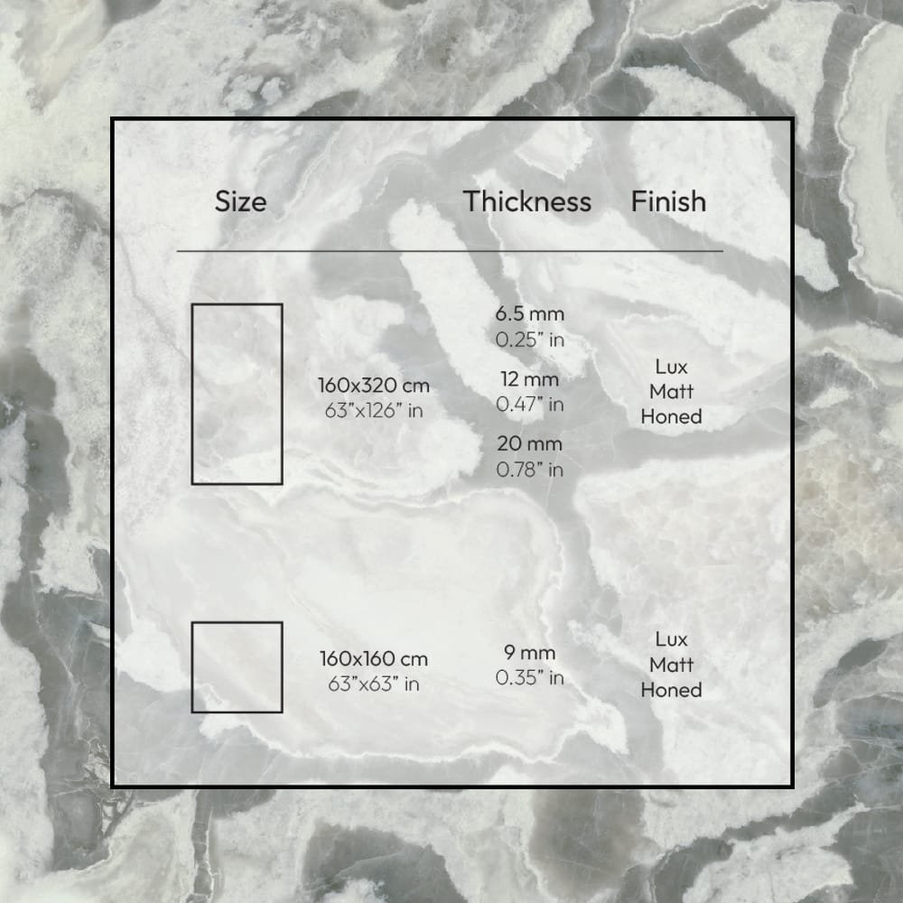 Dover is available in large formats like 162×324 cm. Moreover, 160×320 cm slabs allow seamless installations. Furthermore, bookmatch options create dramatic mirrored effects. Additionally, 120×278 cm and smaller sizes offer flexibility. Thicknesses include 6.5 mm for walls. Moreover, 12 mm suits floors and counters.