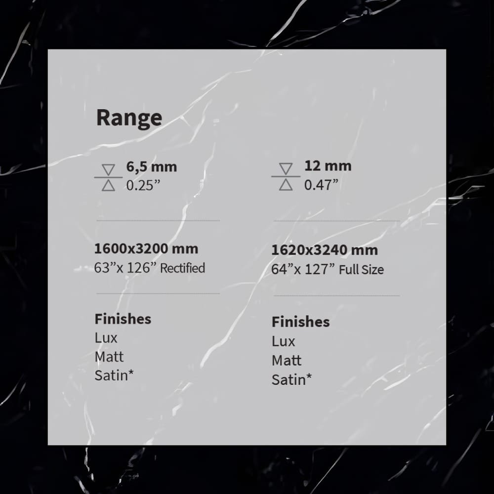 You select 6.5 mm or 12 mm thicknesses strategically. Also, embrace Lux, Matt, or Satin finishes diversely. Full size reaches 1620×3240 mm imposingly. Rectified format spans 1600×3200 mm seamlessly. Thus, monolithic statements dominate boldly. Meanwhile, fiber option fortifies slabs resiliently. Consequently, dramatic beauty withstands rigorous use enduringly. Next, lightweight 6.5 mm enables vertical applications ingeniously.