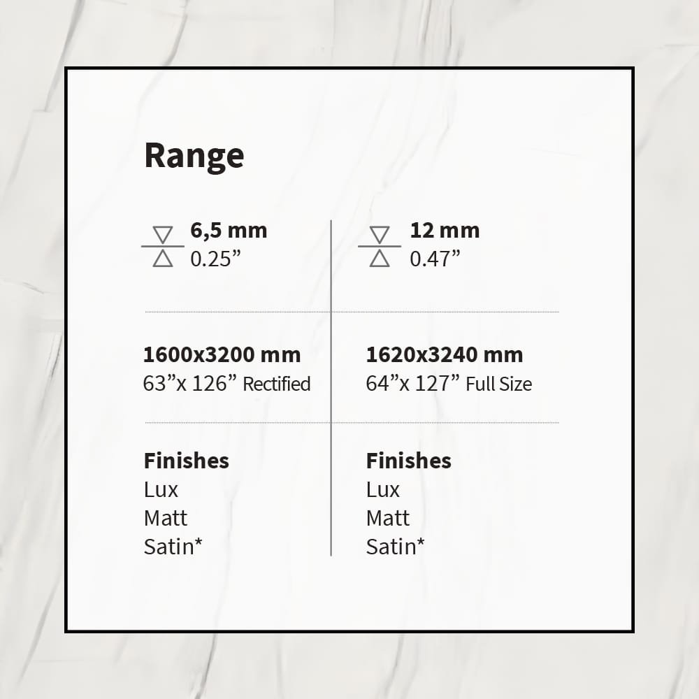 You choose 6.5 mm or 12 mm thicknesses precisely. Also, select Lux, Matt, or Satin finishes flexibly. Full size spans 1620×3240 mm grandly. Rectified measures 1600×3200 mm impeccably. Thus, expansive installations shine dramatically. Meanwhile, fiber reinforcement strengthens slabs durably. Consequently, pure aesthetics endure demanding applications reliably. Next, slim 6.5 mm suits cladding innovatively.