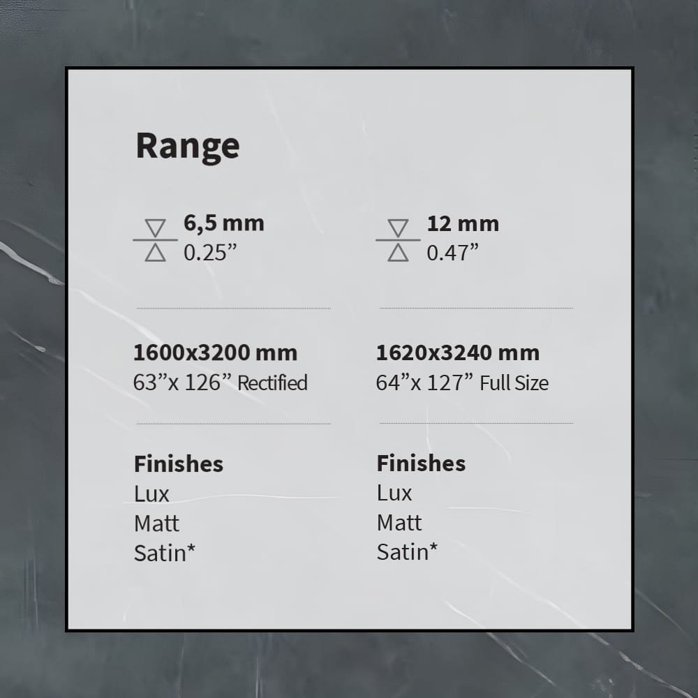 Pietra Grey provides 6.5 mm and 12 mm thicknesses for flexibility. Also, Lux, Matt, and Satin finishes enhance versatility. Thus, it adapts to diverse lighting conditions. Meanwhile, 1620×3240 mm full size covers large areas efficiently. Furthermore, 1600×3200 mm rectified edges ensure precise joints.