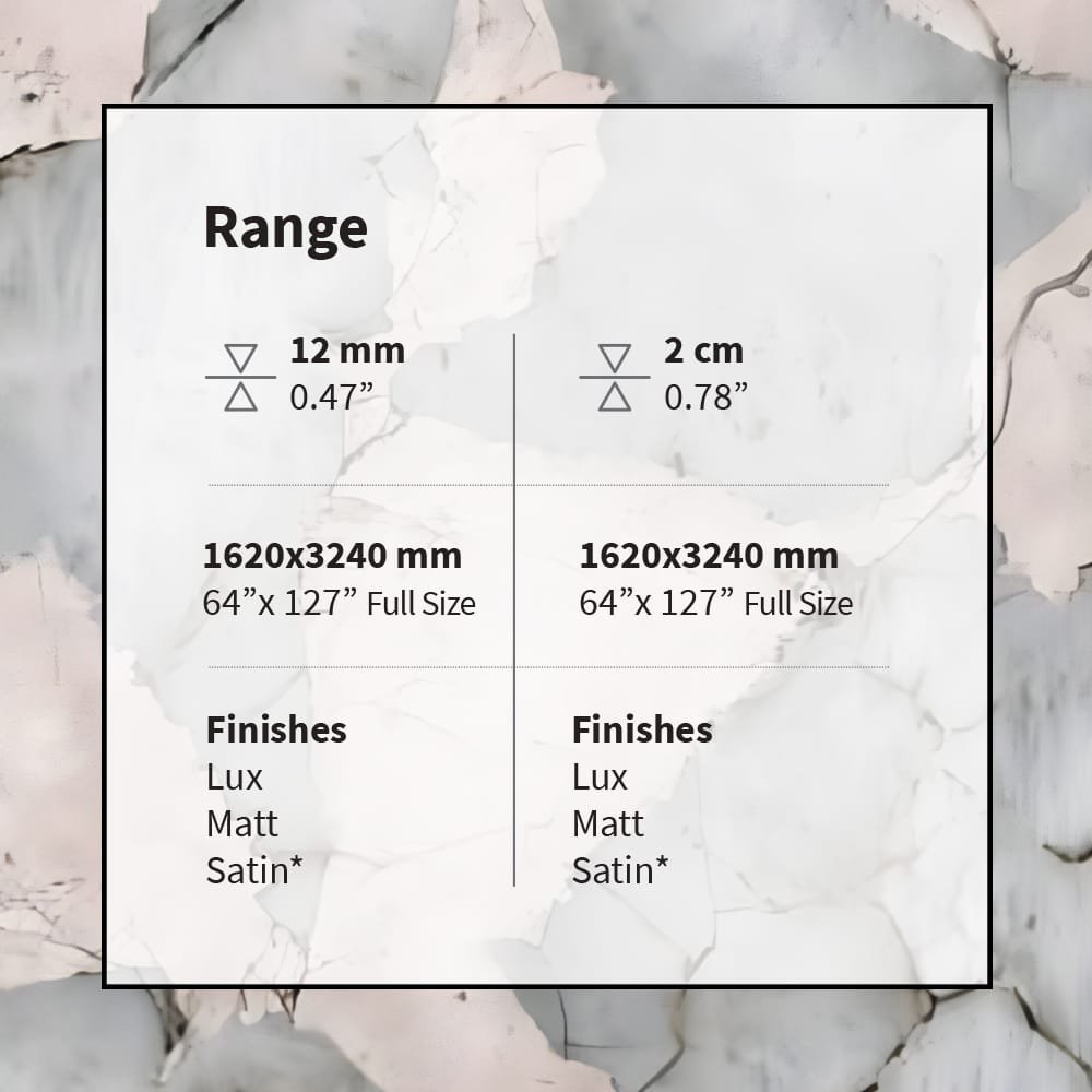 Pack 22 slabs of 12 mm per frame. Load 14 slabs of 2 cm securely. 1620×3240 mm full size covers vast surfaces. Large format creates seamless expanses.