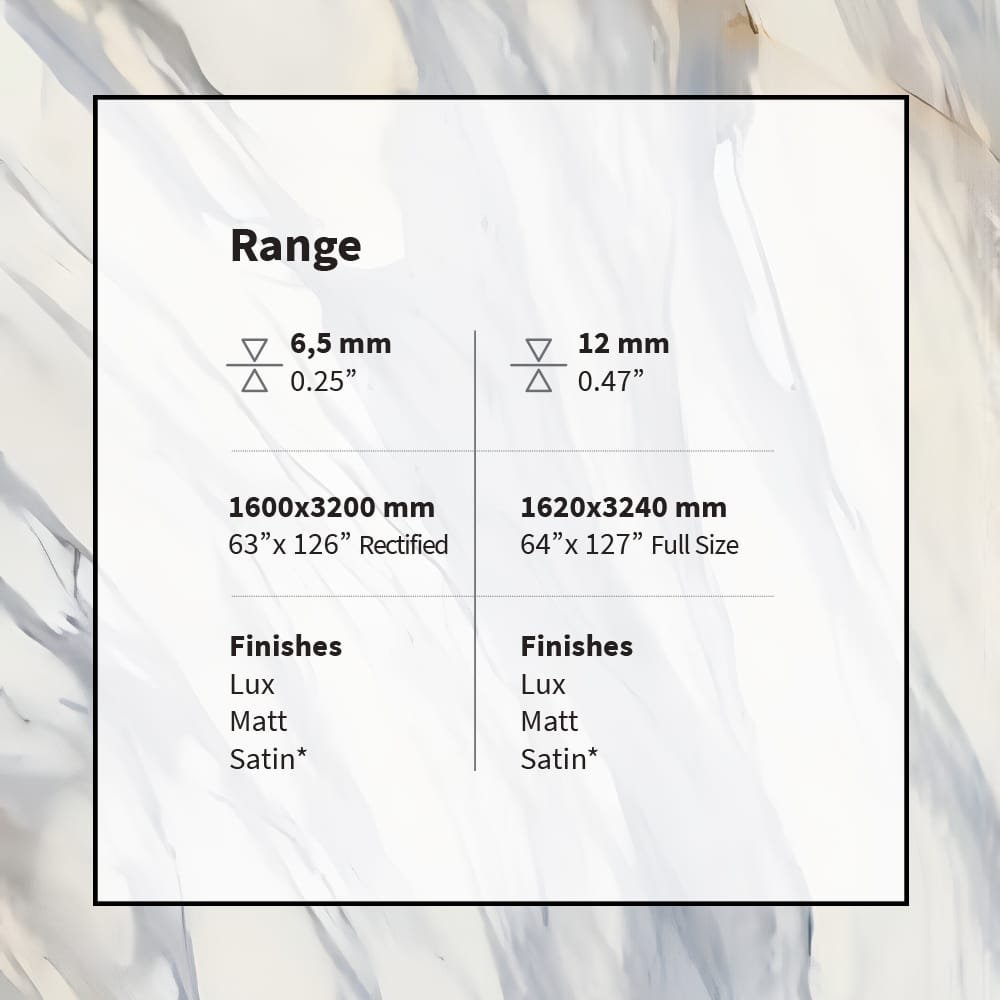 Statuario Azzurro by Italslab revives azure-tinged Statuario marble with delicate blue-gray veins. Moreover, it infuses interiors with ethereal allure. First, Lux finish gleams vibrantly. Next, Matt finish softens reflections. Meanwhile, Satin finish caresses light gently. Therefore, it suits varied lighting schemes. Additionally, 6.5 mm perfects slim facades. Consequently, 12 mm fortifies demanding roles.